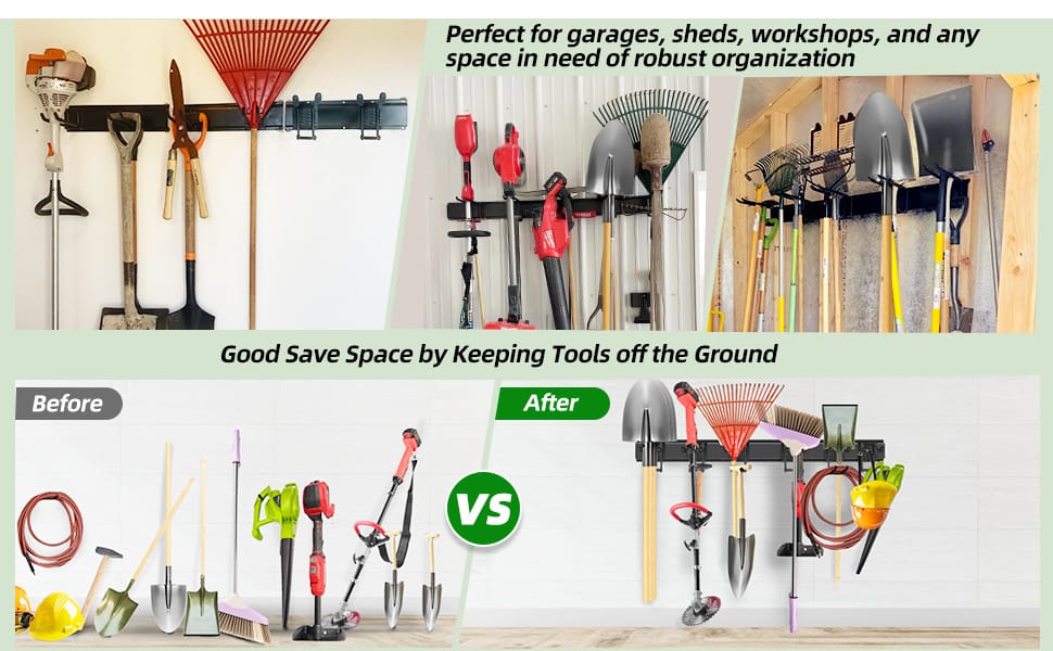 - Versatile Storage: Perfect for organizing shovels, rakes, bikes, brooms, and mops.