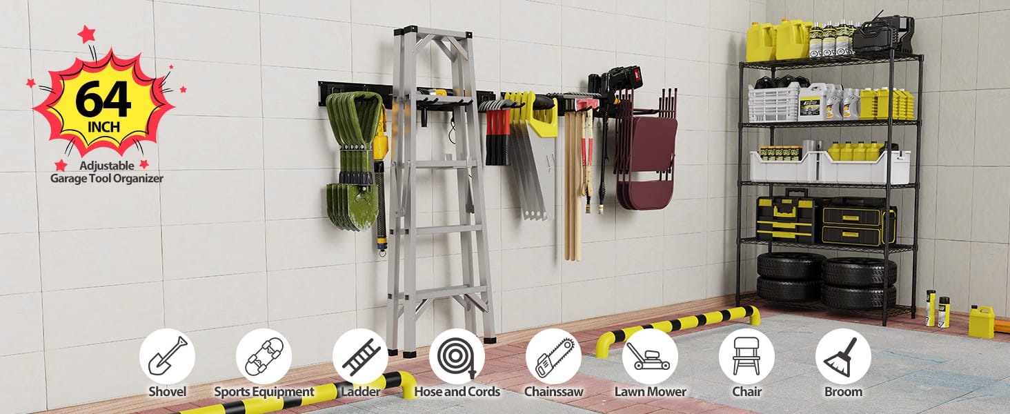 This wall-mounted organizer provides efficient storage for homes, businesses, and garages. It's built to hold items like garden tools, shovels, rakes, brooms, mops, and extension cords. You can also store hoses, power tools, and sports gear such as helmets, boots, ice skates, hockey sticks, and ski equipment. Its design keeps spaces neat and accessible, making it easier to find what you need.