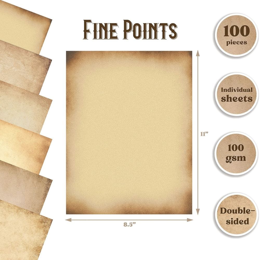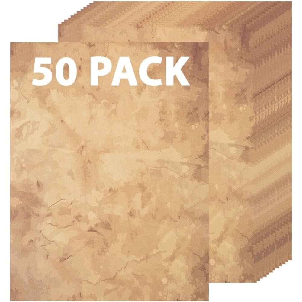 Enhance your projects with our 100-pack of letter-size (8.5" x 11") double-sided weathered-look faux parchment paper. Each sheet is printed in 6 light-to-medium colored designs, ensuring your handwritten notes or printed text stand out beautifully.