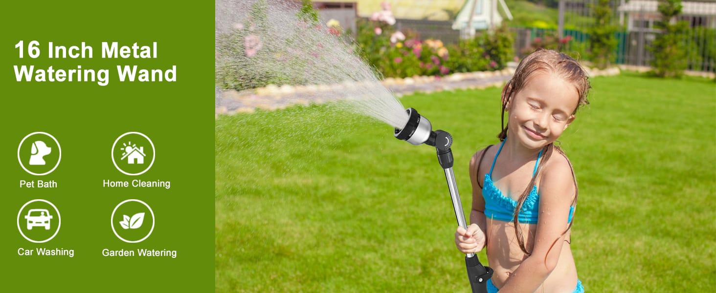 Whether you're watering plants or washing your SUV, our watering wand's 180° adjustable head and multi-pattern settings cater to all your home and garden needs. Its length is perfect for reaching hanging baskets or vehicle tops without the bulkiness of traditional models.