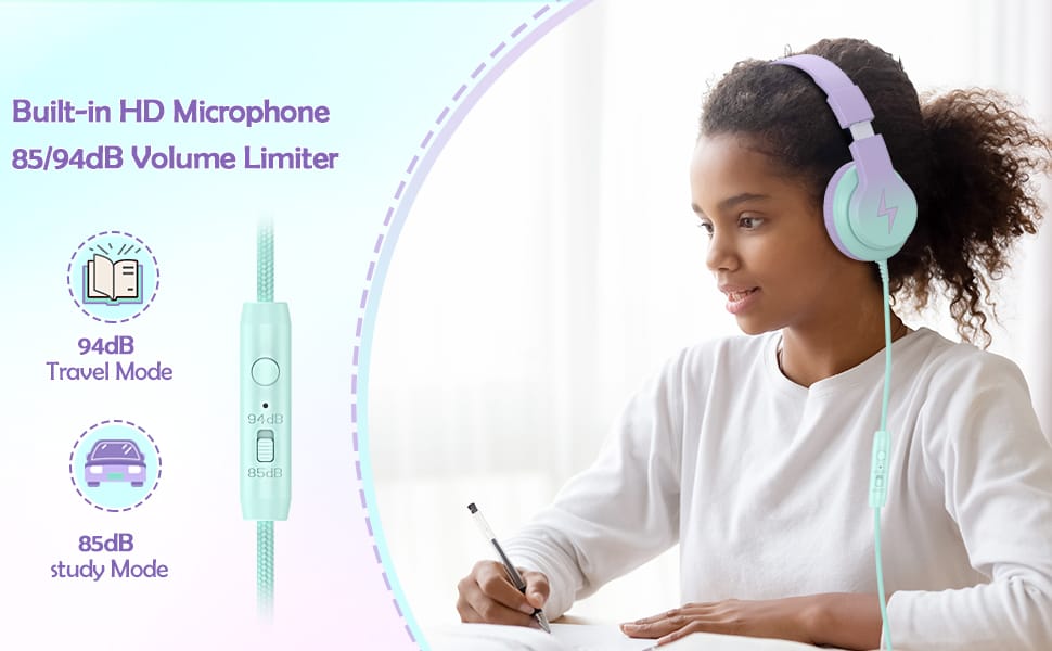 Safe Volume 85/94dB, HD Mic Stereo Sound Over-Ear Girls Boys Headphones